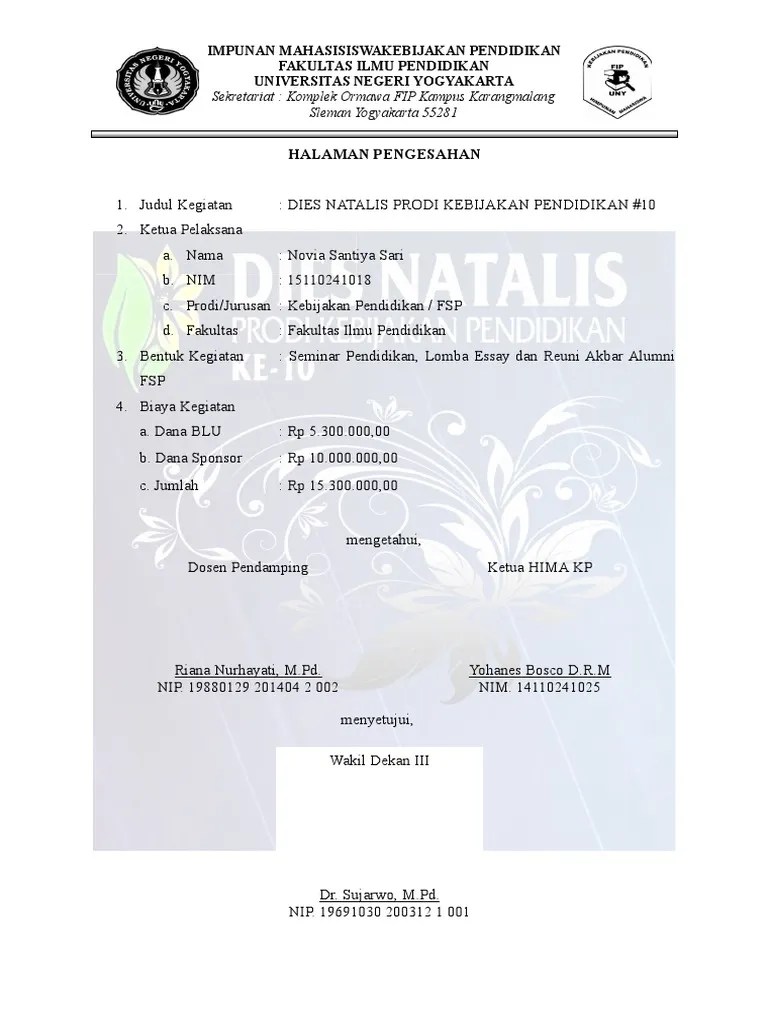 Sebuah masa yang cukup panjang dalam rangka memantapkan jati dirinya sebagai sebuah . 8192019 proposal sponsorship dies natalis 119 8192019 proposal sponsorship dies natalis 219 8192019 proposal sponsorship dies natalis 319 8192019 proposal . Proposal kegiatan seminar & studium generale. Nyaman bagi civitas akademika ugm sekaligus menjadi contoh yang baik bagi . Contoh proposal dies natalis smp proposal adalah suatu usulan kegiatan atau rencana yang diterangkan dalam bentuk rancangan kerja secara .